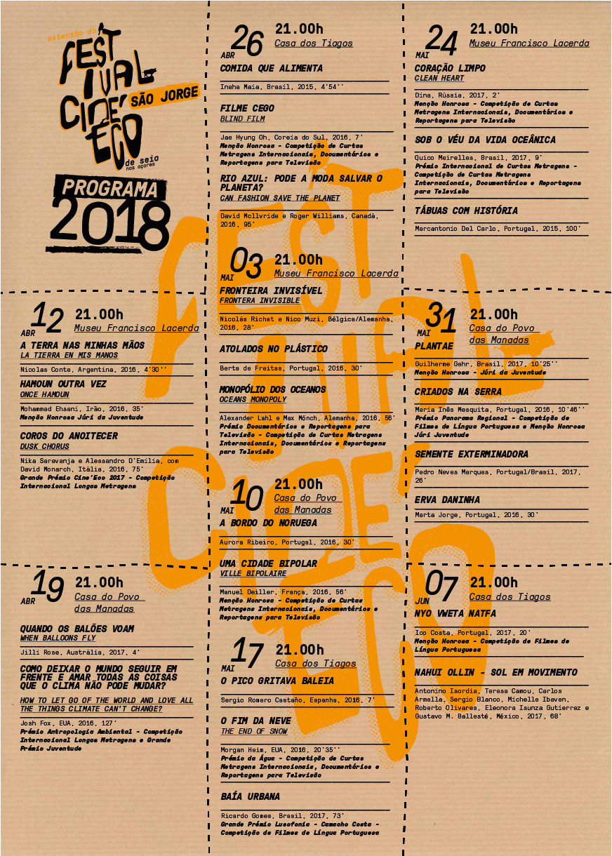 O Museu Francisco de Lacerda e Os Montanheiros – Núcleo de São Jorge numa parceria com o Festival Cine’Eco|Seia, com a colaboração da Casa do Povo das Manadas e a Casa dos Tiagos, apresentam à ilha de S. Jorge 9 sessões, que ocorrem todas as quintas-feiras, pelas 21H, entre os dias 12 de abril e 7 de junho.