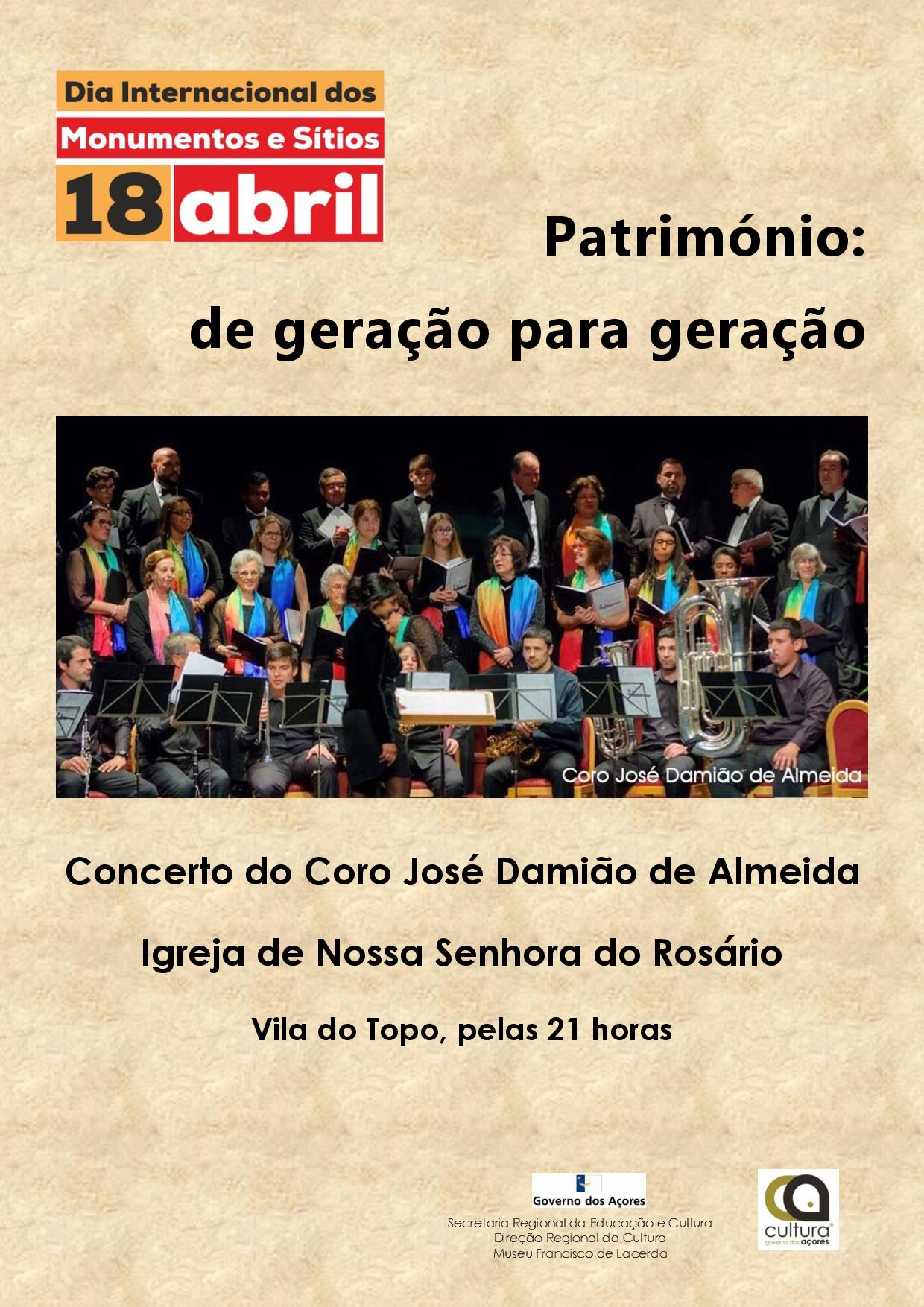 No âmbito das comemorações do Dia Internacional dos Monumentos e Sítios 2018, subordinado ao tema “Património Cultural: de geração em geração”, o Museu Francisco de Lacerda promove no dia 18 de abril, pelas 21h00, na igreja de Nossa Senhora do Rosário, Topo, a realização de um concerto pelo coro José Damião de Almeida, que apresentará um repertório de música erudita e temas tradicionais açorianos.