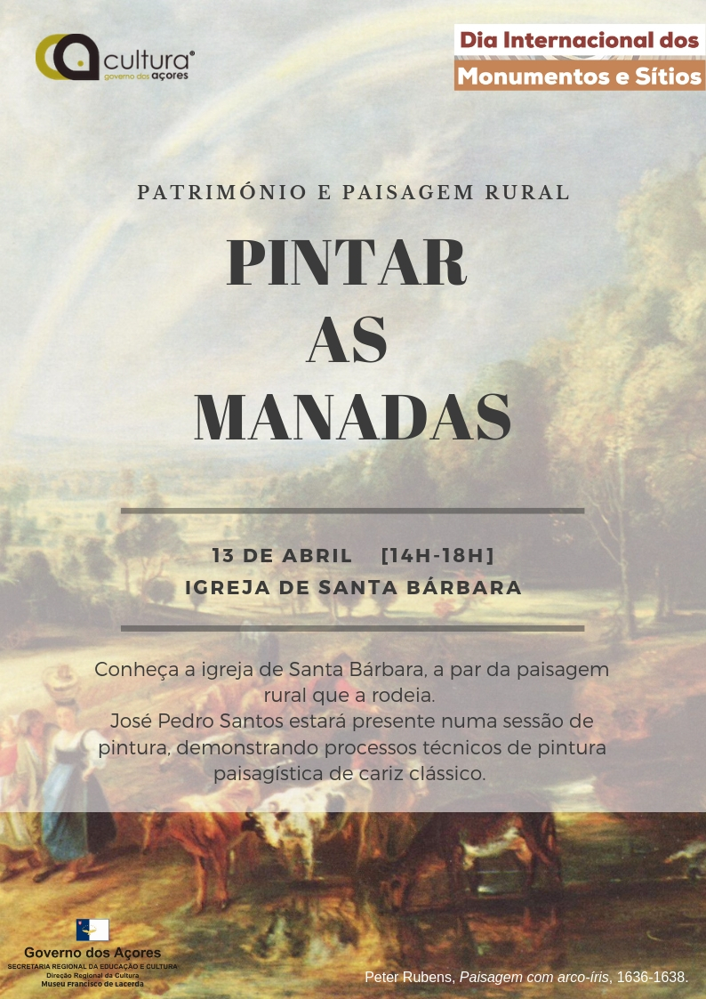 A Direção Regional da Cultura, através do Museu Francisco Lacerda, comemorará no dia 13 de abril, entre as 14.00h e as 18.00h, o Dia Internacional dos Monumentos e Sítios, com uma atividade de Pintura In Situ, intitulada “Pintar as Manadas”, cujo responsável será o Técnico Superior desta instituição, José Pedro Santos.
